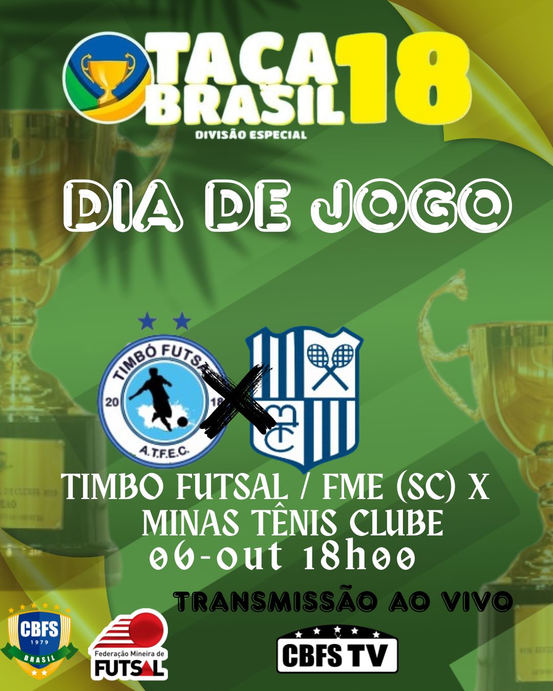 ⚽️ Daqui a pouco às 18h00, em Fortaleza (CE), o Minas Tênis Clube entra em quadra, pela Taça Brasil de Clubes Sub 18 – Masculino, Divisão Especial , onde enfrenta o Esporte Timbó Futsal / FME (SC).